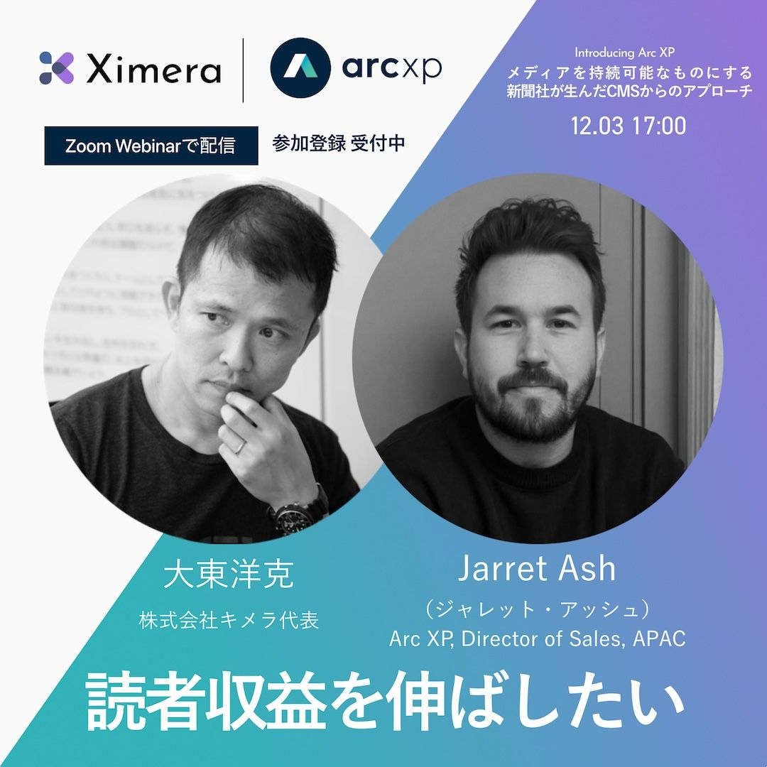 イベント情報Arc XP: メディアを持続可能なものにする 新聞社が生んだCMSからのアプローチ2025/11/01Ximera2025/11/01Mar 3, 2026 4:56 AMイベント情報CoffeeTable with Ximera 3「続・Webメディアの読者体験とサブスクリプション」(2025-08-19)2025/07/01Ximera2025/07/01Mar 3, 2026 4:56 AMイベント情報CoffeeTable with Ximera 2「Webメディアの読者体験とサブスクリプション」(2025.07.16)2025/06/01Ximera2025/06/01Mar 3, 2026 4:56 AMイベント情報CoffeeTable with Ximera(2025.06.24)2025/05/01Ximera2025/05/01Mar 3, 2026 4:56 AMイベント情報コンテンツ制作の現場とデータ活用のケーススタディ(2023-11-29)2023/10/01Ximera2023/10/01Mar 3, 2026 4:56 AMイベント情報メディアのプロダクトをつくり、育てるチームのつくりかた(2023-11-15)2023/10/01Ximera2023/10/01Mar 3, 2026 4:56 AMイベント情報記者・編集者のためのやさしく取り組むコンテンツ分析2023/06/01Ximera2023/06/01Mar 3, 2026 4:56 AMイベント情報メディアのサブスクリプション事業と向き合う〜「絶望」を招く落とし穴と打開のためのカギ〜2023/04/01Ximera2023/04/01Mar 3, 2026 4:56 AMイベント情報パブリッシャーのための読者理解・価値とニーズ講座【ゲスト:松本健太郎】2022/10/01Ximera2022/10/01Mar 3, 2026 4:56 AMイベント情報NHK NEWS WEBに聞く、データと向き合う戦略とその現場2022/09/01Ximera2022/09/01Mar 3, 2026 4:56 AMイベント情報オンラインイベント:メディアとPRがつなぐ地域社会の未来2022/07/01Ximera2022/07/01Mar 3, 2026 4:56 AMイベント情報GA4への対応、 一体どうすれば?メディア運営のためのKPIとデータ分析体制を徹底解説2022/06/01Ximera2022/06/01Mar 3, 2026 4:56 AMイベント情報『週刊文春 電子版』サブスクリプションビジネスの立ち上げから成長までの実践知2022/06/01Ximera2022/06/01Mar 3, 2026 4:56 AMイベント情報天狼院書店に学ぶ「生き残るためのイノベーション戦略」2022/04/01Ximera2022/04/01Mar 3, 2026 4:56 AMイベント情報もっと読まれる・もっと届くコンテンツのためのデータ活用(2021/09/07)2021/08/012021/08/01Mar 3, 2026 4:56 AMイベント情報広告マネタイズの現状と展望(2021/09/28)2021/08/01Ximera2021/08/01Mar 3, 2026 4:56 AMイベント情報はじめてのデジタルサブスクリプション実装(2021/6/29)2021/05/01Ximera2021/05/01Mar 3, 2026 4:56 AMイベント情報はじめてのデジタルサブスクリプション運営(2021/4/27)2021/03/01Ximera2021/03/01Mar 3, 2026 4:56 AMイベント情報メディアのエンゲージメントを高める!ニュースレター最前線(2021/3/22)2021/02/01Ximera2021/02/01Mar 3, 2026 4:56 AMイベント情報パブリッシャーのサブスクリプションビジネス2021年の展望(2021/2/18)2021/01/01Ximera2021/01/01Mar 3, 2026 4:56 AMイベント情報パブリッシャーのための愛されるSNSマーケティング(2020/12/2)2020/11/01Ximera2020/11/01Mar 3, 2026 4:56 AMイベント情報デジタル時代のパブリッシャー組織戦略(2020/10/28)2020/09/01Ximera2020/09/01Mar 3, 2026 4:56 AMイベント情報パブリッシャーのためのインサイト分析(2020/9/17)2020/08/01Ximera2020/08/01Mar 3, 2026 4:56 AMイベント情報事業成長とブランディングを叶える分析&KPIことはじめ(2020/8/26)2020/07/01Ximera2020/07/01Mar 3, 2026 4:56 AMイベント情報日本流・新聞社のデジタル戦略(2020/7/8)2020/06/01Ximera2020/06/01Mar 3, 2026 4:56 AMイベント情報アフターコロナのメディア成長に必要なこと(2020/6/17)2020/05/01Ximera2020/05/01Mar 3, 2026 4:56 AMイベント情報現場目線で学ぶ、PVだけに頼らない「人が集まる」「読まれる」メディアの作り方2019/08/01Ximera2019/08/01Mar 3, 2026 4:56 AMイベント情報ダイヤモンド社に学ぶ、紙×Webを成功に導く組織づくりのヒント2019/08/01Ximera2019/08/01Mar 3, 2026 4:56 AMイベント情報株式会社キメラ(英語表記: Ximera, Inc.)〒150-0031 東京都渋谷区桜丘町23番17号会社概要
